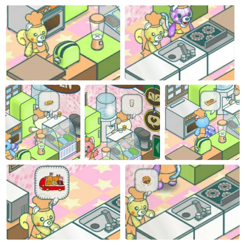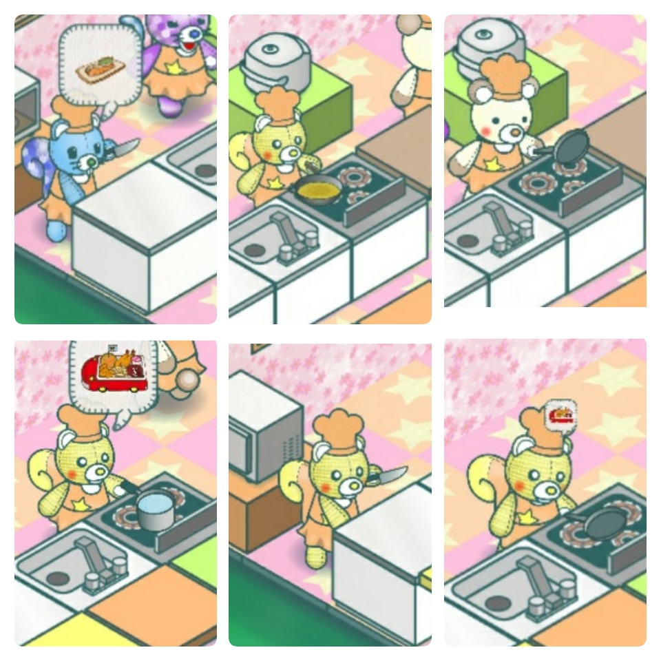 ぬいぐるみは調理の工程によって道具を使い分けています。包丁やお鍋、フライパンなどなど。天ぷらうどんではちゃんと揚げ物をしていました。(上段、中央の写真)